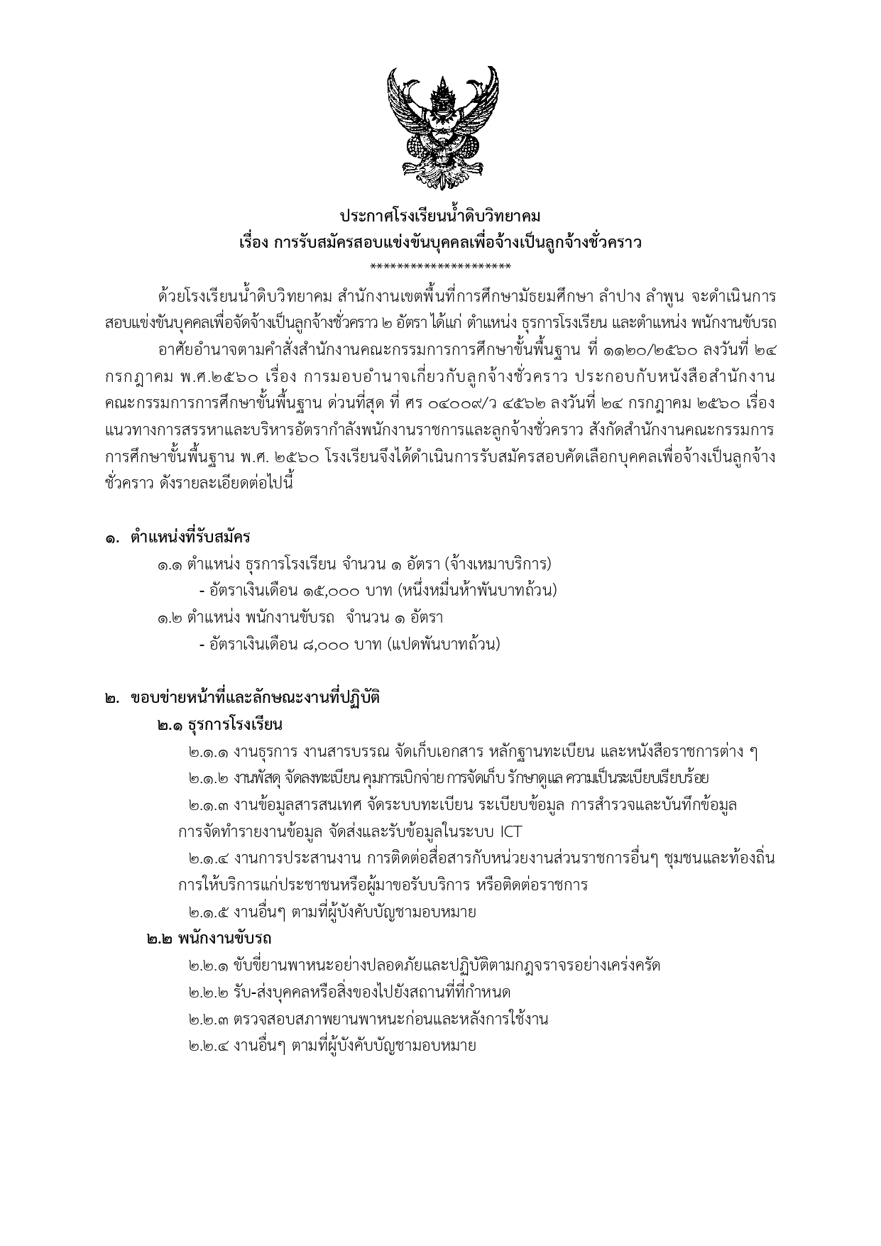 โรงเรียนน้ำดิบวิทยาคม จังหวัดลำพูน ประกาศรับสมัครคัดเลือกบุคคลเพื่อจ้างเป็นลูกจ้างชั่วคราว ตำแหน่งธุรการโรงเรียน และตำแหน่งพนักงานขับรถ