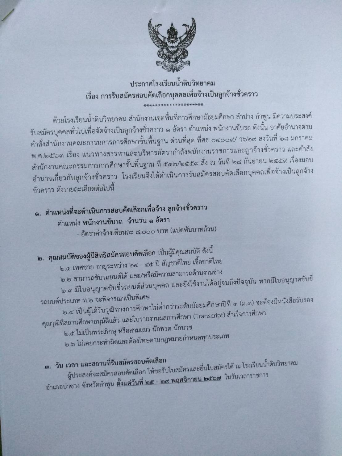 ประกาศ รับสมัครลูกจ้างชั่วคราวตำแหน่งพนักงานขับรถ