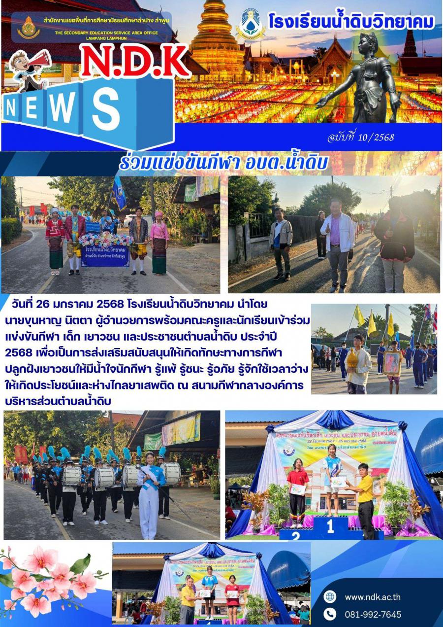 วันที่ 26 มกราคม 2568 โรงเรียนน้ำดิบวิทยาคม นำโดยนายขุนหาญ นิตตา ผู้อำนวยการพร้อมคณะครูและนักเรียนเข้าร่วมแข่งขันกีฬา เด็ก เยาวชน และประชาชนตำบลน้ำดิบ ประจำปี พ.ศ. 2568 เพื่อเป็นการส่งเสริมสนับสนุนให้เกิดทักษะทางการกีฬา ปลูกฝังเยาวชนให้มีน้ำใจนักกีฬา รู้แพ้ รู้ชนะ รู้อภัย รู้จักใช้เวลาว่างให้เกิดประโยชน์และห่างไกลยาเสพติด ณ สนามกีฬากลางองค์การบริหารส่วนตำบลน้ำดิบ