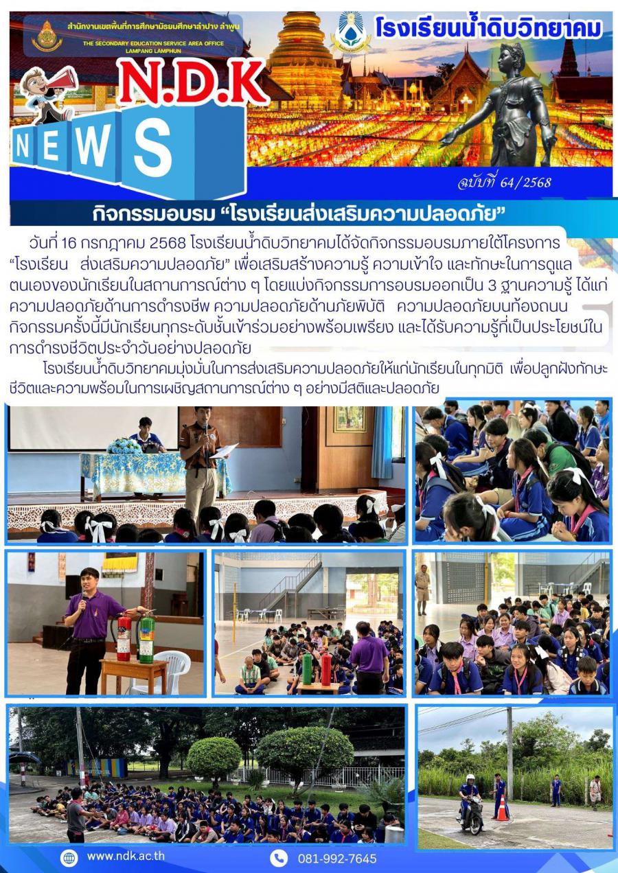 โรงเรียนน้ำดิบวิทยาคมมุ่งมั่นในการส่งเสริมความปลอดภัยให้แก่นักเรียนในทุกมิติ เพื่อปลูกฝังทักษะชีวิตและความพร้อมในการเผชิญสถานการณ์ต่าง ๆ อย่างมีสติและปลอดภัย