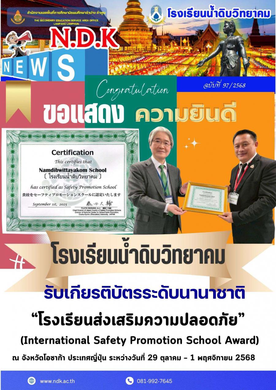นายขุนหาญ นิตตา ผู้อำนวยการโรงเรียนน้ำดิบวิทยาคม เข้าร่วมพิธีรับมอบ เกียรติบัตรระดับนานาชาติ “โรงเรียนส่งเสริมความปลอดภัย” (International Safety Promotion School Award) ณ จังหวัดโอซาก้า ประเทศญี่ปุ่น ระหว่างวันที่ 29 ตุลาคม – 1 พฤศจิกายน 2568