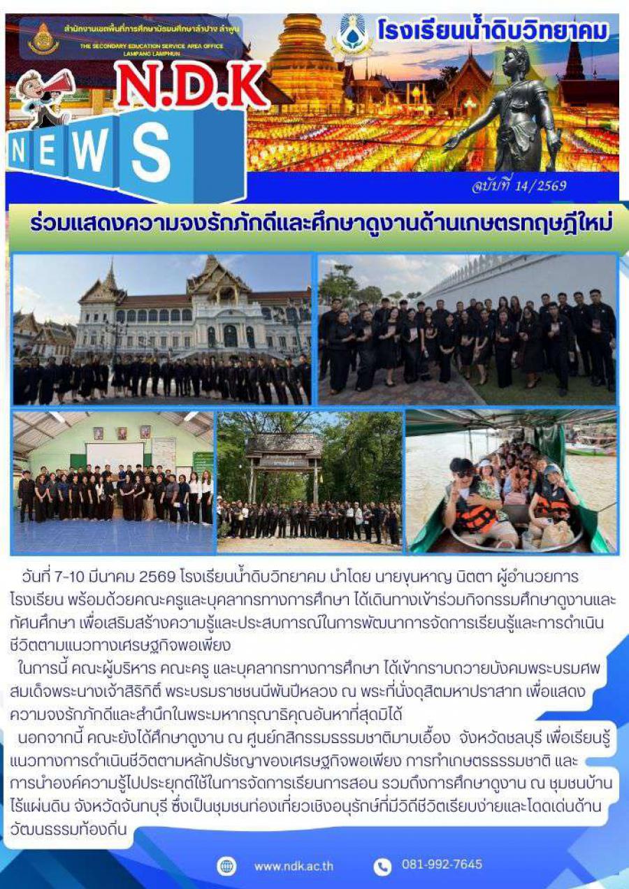 วันที่ 7–10 มีนาคม 2569 โรงเรียนน้ำดิบวิทยาคม นำโดย นายขุนหาญ นิตตา ผู้อำนวยการโรงเรียนน้ำดิบวิทยาคม พร้อมด้วยคณะครูและบุคลากรทางการศึกษา ได้เดินทางเข้าร่วมกิจกรรมศึกษาดูงานและทัศนศึกษา เพื่อเสริมสร้างความรู้และประสบการณ์ในการพัฒนาการจัดการเรียนรู้และการดำเนินชีวิตตามแนวทางเศรษฐกิจพอเพียง