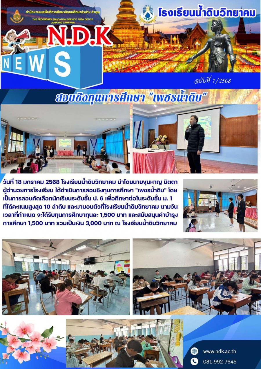 วันที่ 18 มกราคม 2568 โรงเรียนน้ำดิบวิทยาคม นำโดยนายขุนหาญ นิตตา ผู้อำนวยการโรงเรียน ได้ดำเนินการสอบชิงทุนการศึกษา "เพชรน้ำดิบ" โดยเป็นการสอบคัดเลือกนักเรียนระดับชั้น ป. 6 เพื่อศึกษาต่อในระดับชั้น ม. 1 ที่ได้คะแนนสูงสุด 10 ลำดับ และมามอบตัวที่โรงเรียนน้ำดิบวิทยาคม ตามวัน เวลาที่กำหนด จะได้รับทุนการศึกษาทุนละ 1,500 บาท และสนับสนุนค่าบำรุงการศึกษา 1,500 บาท