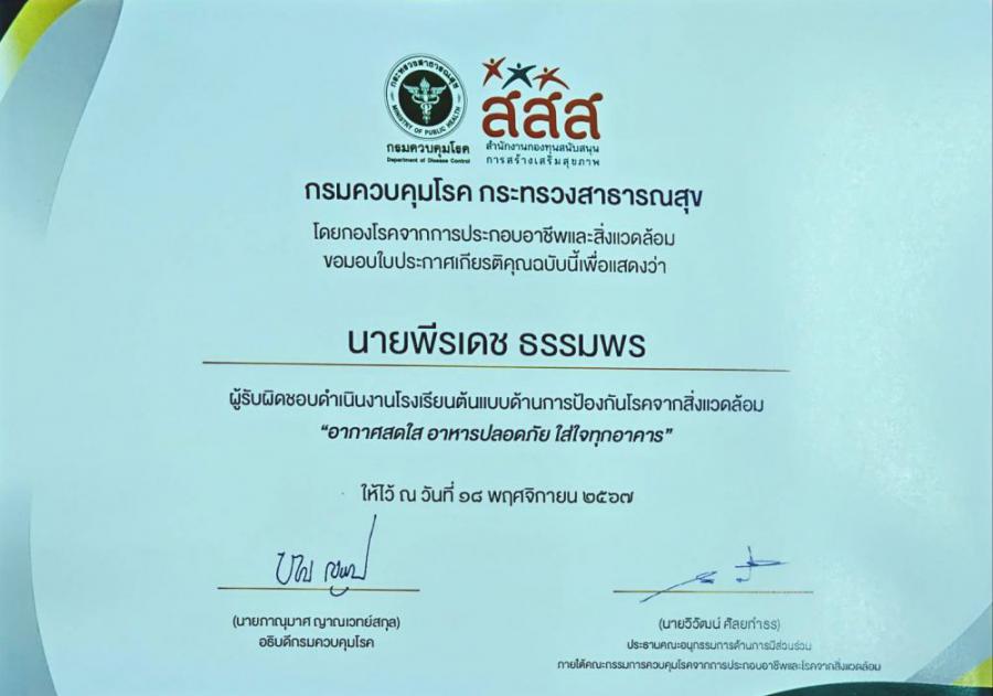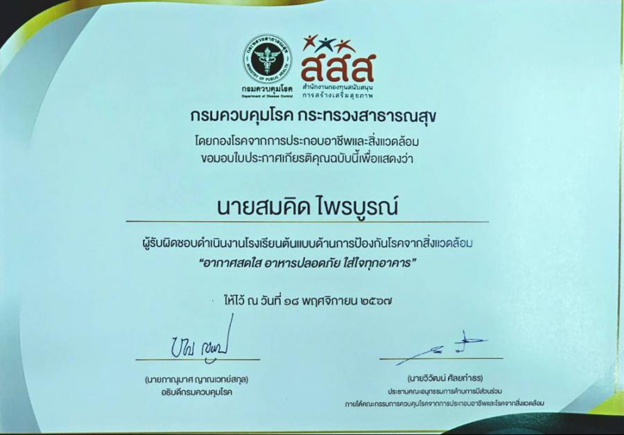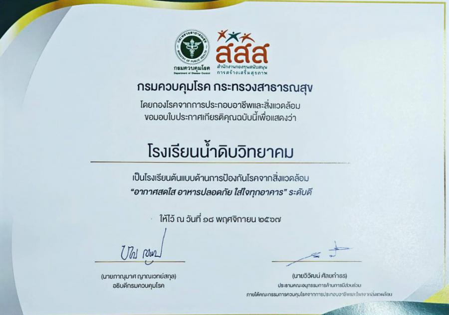 วันที่ 18 พฤศจิกายน 2567 นายขุนหาญ นิตตา ผู้อำนวยการโรงเรียนน้ำดิบวิทยาคม มอบหมายให้ นายสมคิด ไพรบูรณ์ ครูชำนาญการพิเศษและนายพีรเดช ธรรมพร ครูอัตราจ้าง เข้าร่วมประชุมเชิงปฏิบัติการเพื่อสร้างโรงเรียนต้นแบบ Safety School : อากาศสดใส อาหารปลอดภัย ใส่ใจทุกอาคาร พร้อมกันนี้ ได้เข้ารับโล่และเกียรติบัตรรางวัลโรงเรียนต้นแบบด้านการป้องกันโรคและสิ่งแวดล้อม S:0
